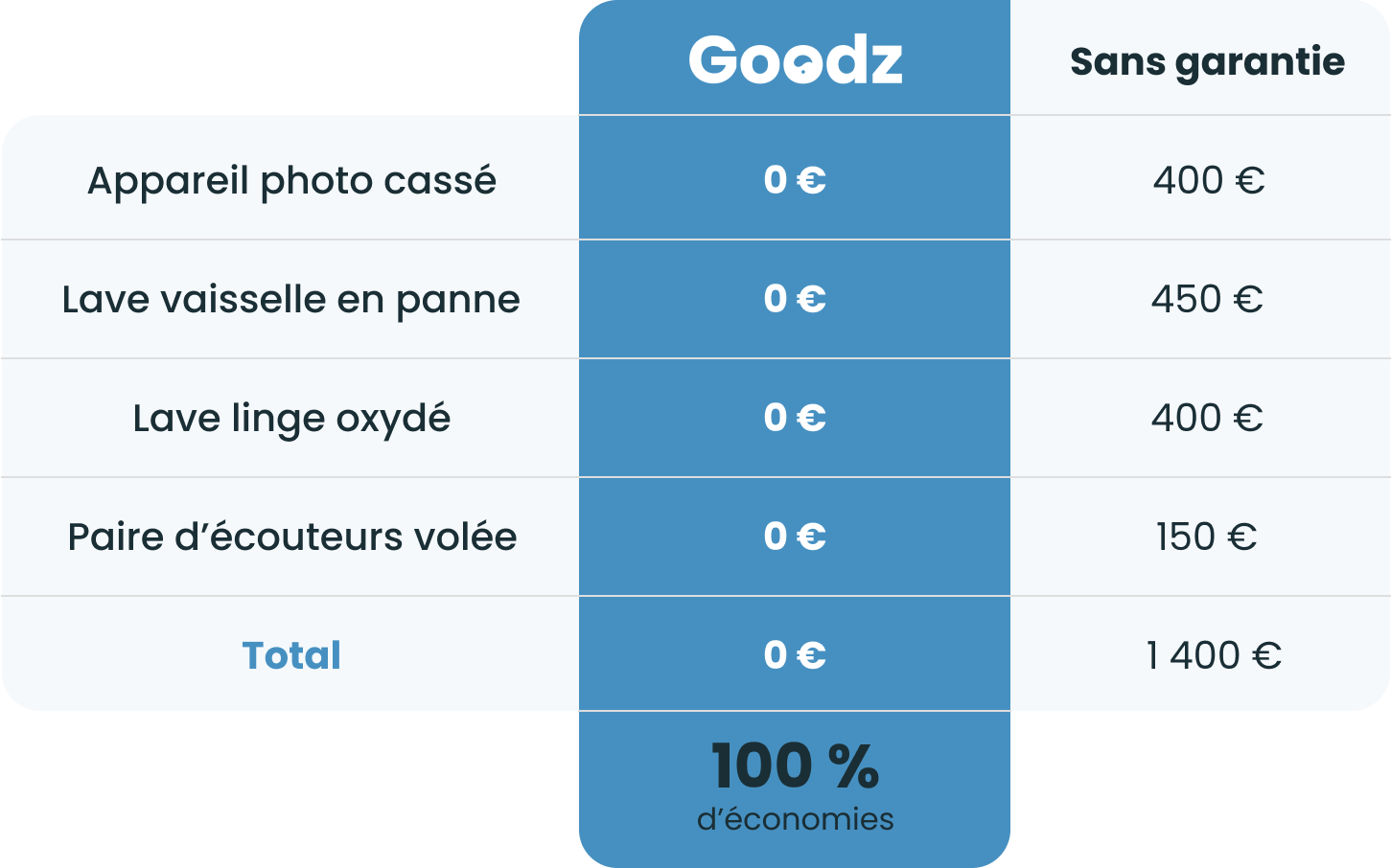 La formule Goodz est une assurance multiproduits. Vous pouvez assurer autant de biens que vous le souhaitez sans limite de valeur. Vous pouvez ajouter et désactiver des biens sur votre contrat en fonction de vos besoins. Plusieurs formules vous permettent d’obtenir un plafond de remboursement allant de 1 000 € à 5 000 €.
