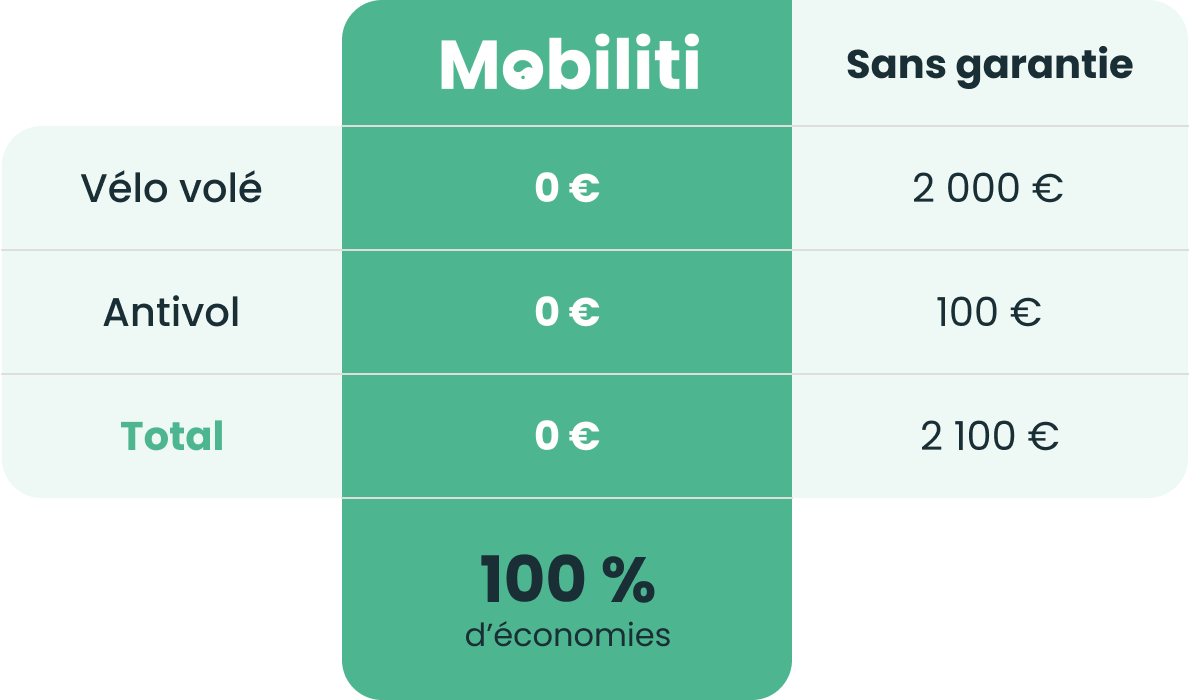 La casse, l'oxydation, la panne, la crevaison*, le vol caractérisé* et la perte accidentelle* sont couverts par votre assurance Mobiliti.
